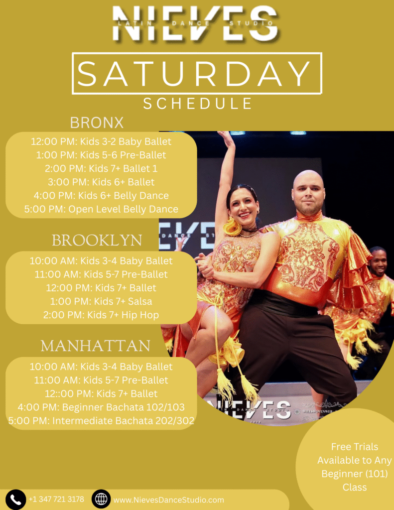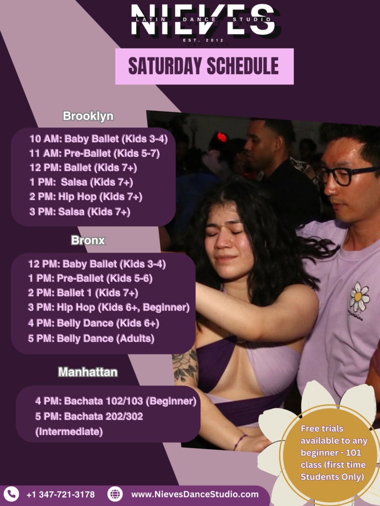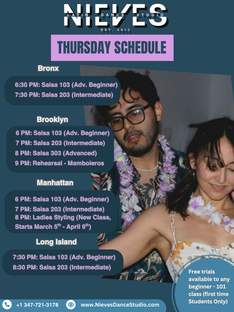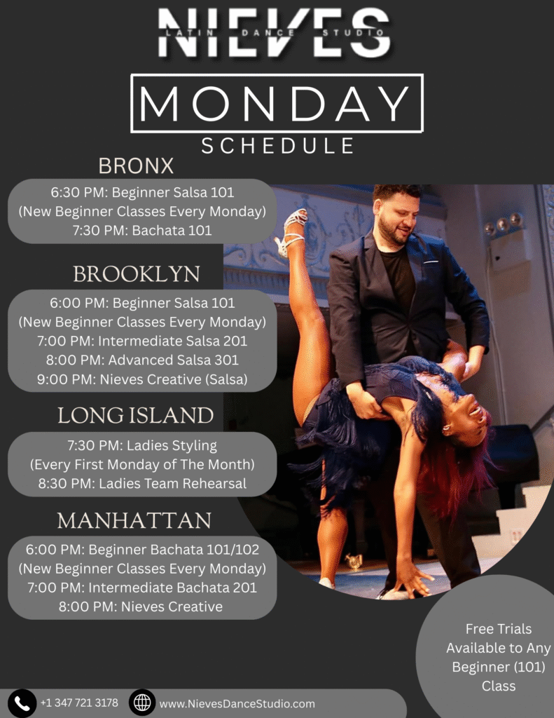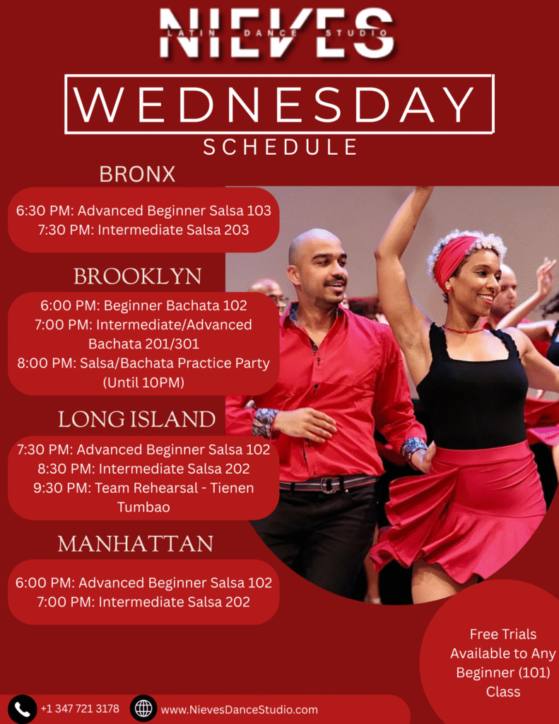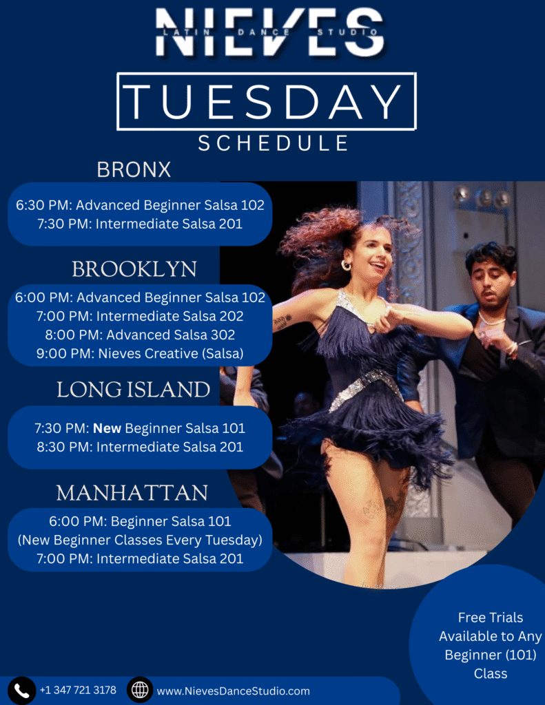 Nieves Latin Dance Studio offers Salsa/Bachata lessons in 4 different locations in NYC. The Classes are fun, easy and its great way to stay active.