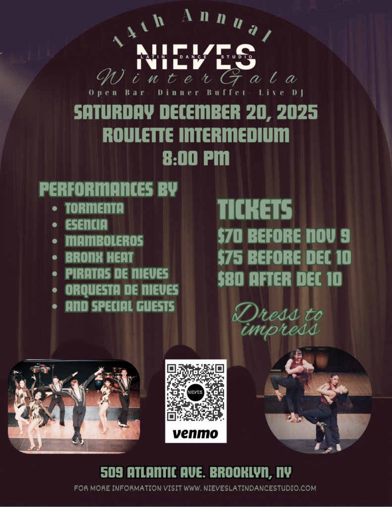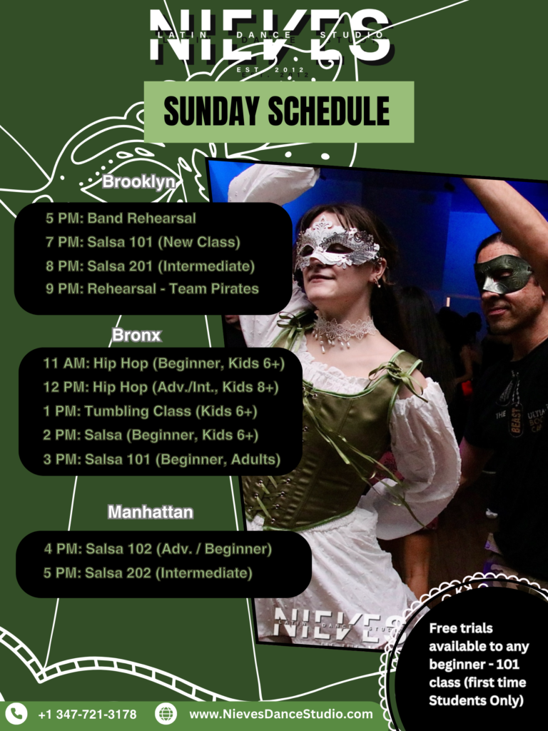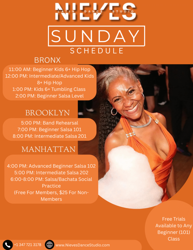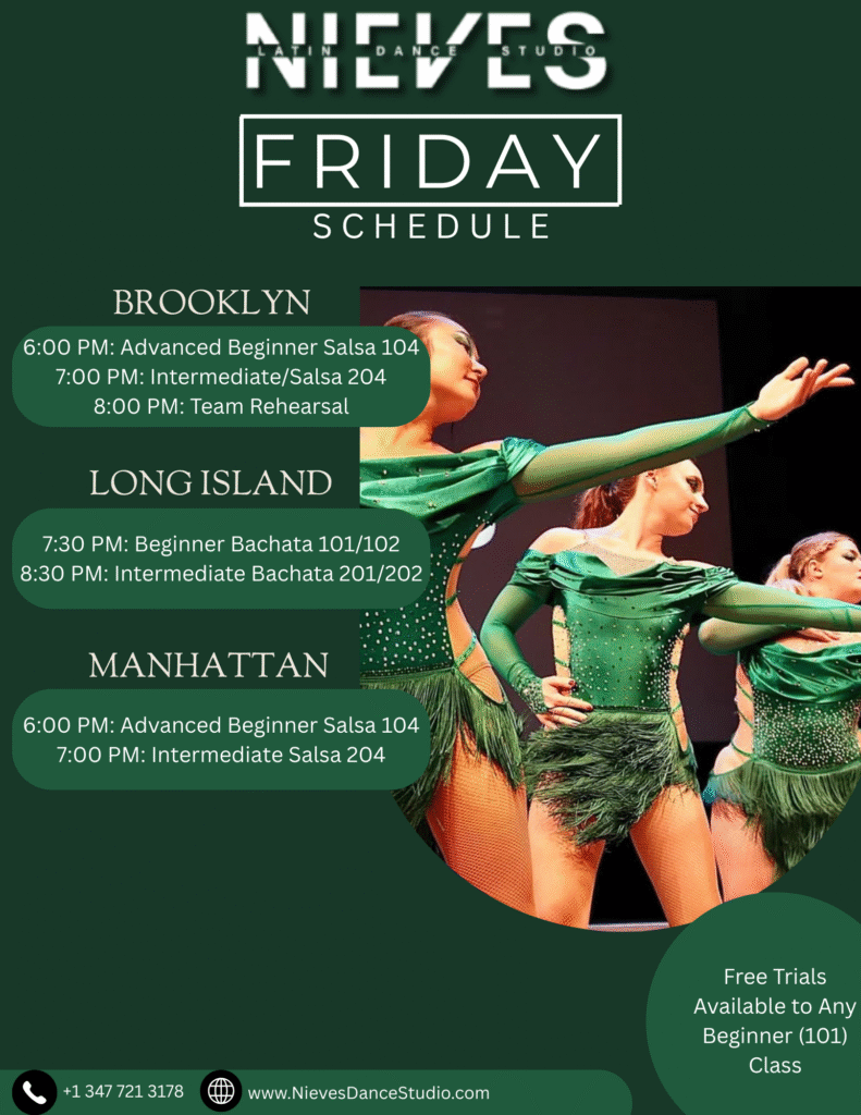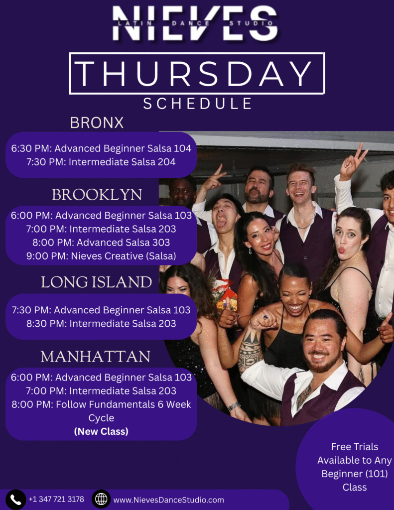Nieves Latin Dance Studio offers Salsa/Bachata lessons in 4 different locations in NYC. The Classes are fun, easy and its great way to stay active.